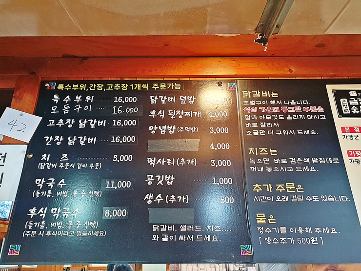메뉴. 상호에서 알 수 있듯이 닭갈비와 막국수를 판매하고 있다. 우리는 먼저 닭갈비를 먹은 후 배가 부르지 않으면 막국수를 먹기로 했다. 그래서 고추장 닭갈비와 간장 닭갈비를 주문했다. 그리고 예약 특전으로 특수 부위도 서비스로 받았다. 특수 부위는 닭 목살이 나온다.