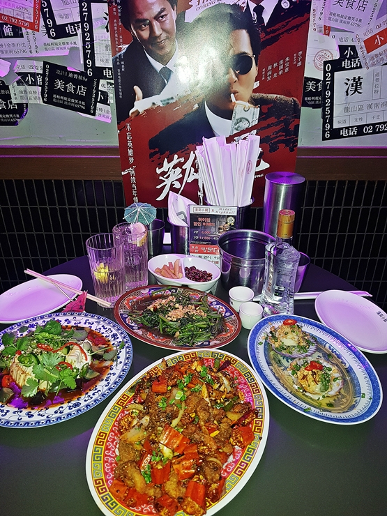 벽에는 이렇게 홍콩 영화 포스터와 어쩌고가 잔뜩 붙어있다. 우리가 앉은 자리에 붙어 있는 영화 포스터는 80년대에 개봉한 영웅본색이었다. 영웅본색을 본 적은 없는데 움짤로만 몇 번 봤다. 주변에서 많이 추천하는 영화이기도 하고, 같이 간 동기가 한 번 꼭 보라고 해서 조만간 보도록 해야지.