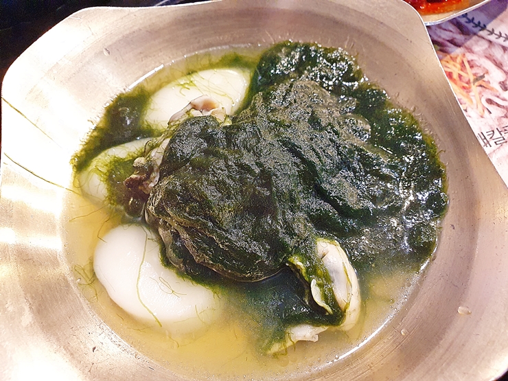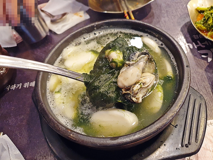 아기다리 고기다리 던 매생이 굴 떡국. 매생이와 굴이 섭섭하지 않게 들어있다. 어릴 때는 흐물흐물한 식감이 싫어서 매생이를 먹지 않았는데, 이제는 겨울에만 되면 나도 모르게 생각이 난다. 짝꿍은 굴 보쌈에 집중을 하겠다며 조금만 먹는다고 해서 온전히 내가 즐길 수 있었다.