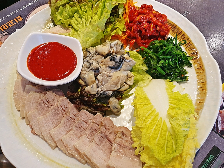 아름다운 모습의 굴 보쌈. 역시 사진은 고기 사진을 찍을 때 가장 보람있다. 수육은 삼겹살 부위를 사용해서 만든다. 딱 봐도 신선한 굴과 함께 배추, 상추, 보쌈김치와 해초가 함께 나온다. 나는 초장을 먹지 않기 때문에 쌈장을 이용해서 먹기로 했다.