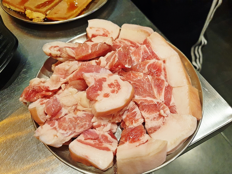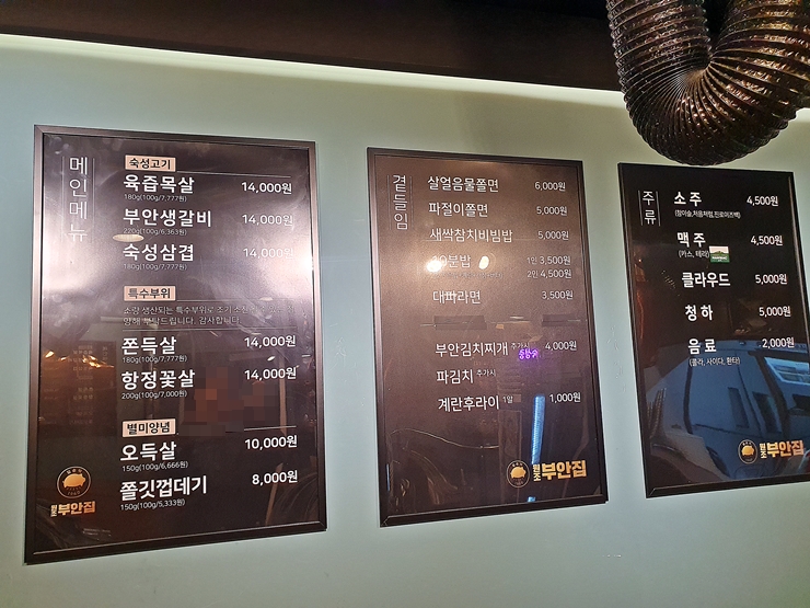 쫀득살. 쫀득살은 뒷덜미살, 꼬들살, 뒷목살이라고도 부른다. 월화고기에서 인기 메뉴로 내세우고 있으며, 원조부안집에서도 마찬가지도. 삼겹살과 항정살의 식감을 동시에 가지고 있는 아주 바람직한 부위라고 할 수 있다. 원조부안집은 고기를 주문하면 처음에는 구워주고 그 이후부터는 직접 구우면 되는 시스템이다.