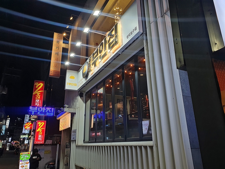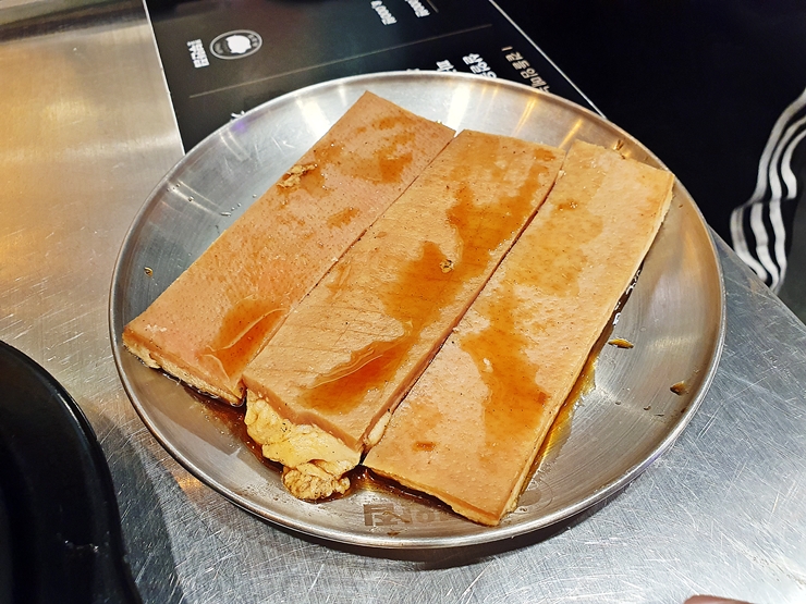 서비스로 받은 돼지 껍데기. 껍데기를 구울 때에 이미 만취가 되어 있어서 따로 찍은 사진이 없다. 이 껍데기가 진짜 맛있었다. 간장 베이스의 양념을 사용했는데, 양념의 간이 강하지 않아서 물리지 않고 먹을 수 있었다. 껍데기 부분에 지방이 많이 붙어 있는 두툼한 스타일인데 쫄깃함과 부드러움을 같이 느낄 수 있다. 지방이 많이 붙어 있는 만큼 많이 먹으면 살이 쉽게 찌지만 송년회 때는 먹어도 된다. 전국 각지에 많은 지점이 있는 원조부안집. 쫄깃하고 맛있는 쫀득살과 돼지껍데기를 먹고 싶다면 한 번 방문할 것을 추천하는 곳이다.