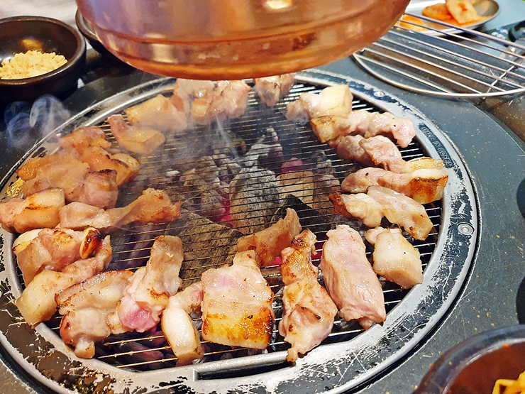 짠. 다 구워졌다. 이제 맛있게 먹어봐야지. 술을 많이 마셔서 고기만 따로 찍은 사진은 없네. 쫀득살의 껍질 부분은 굉장히 쫀득하고 기름이 많고, 살코기는 담백하며 부드럽다. 돼지고기에서 흔히 느낄 수 없는 식감인 사각거림도 함께 느낄 수 있다. 삼겹살보다 지방이 덜 하고 목살보단 기름져서 아주 맛있게 잘 먹었다. 고기가 맛있으면 술이 맛있는 법. 그래서 또 과음을 했지. 후후.