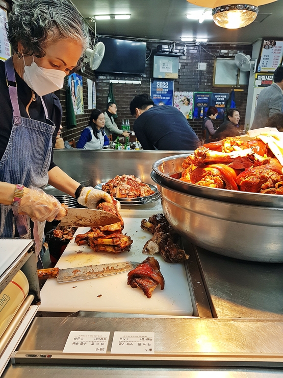 가게에 들어서면 따뜻한 족발을 쉼없이 썰고 있는 모습을 볼 수 있다. 가게 정문 바로 앞에 이런 자리를 배치한 것은 실로 탁월하 선택이 아닐 수 없다. 이렇게 아름다운 모습을 보면 더욱 식욕이 돋고 바람직한 과식을 하게 된다. 고기는 탄수화물에 비해 많이 먹어도 살이 찌지 않으니 마음껏 먹을 수 있다. 족발은 크게 온족발과 냉족발로 나누는데 요새는 온족발이 인기를 끌고 있다. 평안도 족발집은 이런 트랜드에 맞춰서 온족발을 판매하고 있다. 포스팅을 하는 도중에도 괜히 입맛이 살아나고 군침이 도는구나. 다음 달 있을 동기 송년회에 족발을 먹도록 해야지.