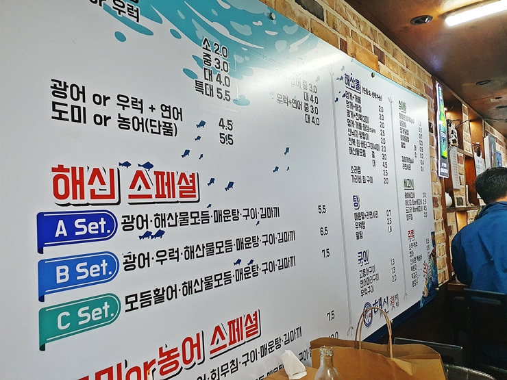 메뉴. 회는 단품으로도 주문이 가능하고 세트로도 주문이 가능하다. 나와 짝꿍은 광어 회, 해산물 모둠, 매운탕, 생선구이와 김마끼가 나오는 A세트를 주문했다. 난 소주를 마시기로 했고 짝꿍은 컨디션이 좋지 않아서 매화수를 마시기로 했다.