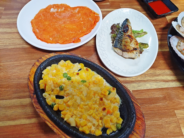 콘 치즈, 김치 전과 고등어 구이. 콘 치즈와 김치 전은 짝꿍이 참 좋아하는 음식이다. 그리고 고등어 구이는 내가 참 좋아하는 음식이다. 콘 치즈와 김치 전은 짝꿍에게 양보하고 난 고등어 구이를 먹었다. 고등어 구이가 1/4 토막만 나오는 것은 좀 아쉬웠지만 그래도 없는 것 보다 낫다.