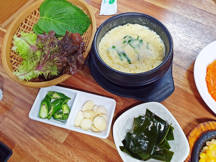 기본으로 제공 되는 상추, 깻잎, 고추, 마늘, 다시마와 계란찜. 고추는 상당히 매웠고 계란찜이 굉장히 맛있었다. 일반 물로 만든 것 같지 않고 다시를 내서 만든 것 같은데 맛이 깊고 진했다. 이 계란찜 하나로 소주 한 병은 뚝딱이지만 술은 최대한 절제 하기로 했다.