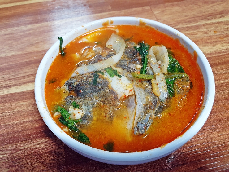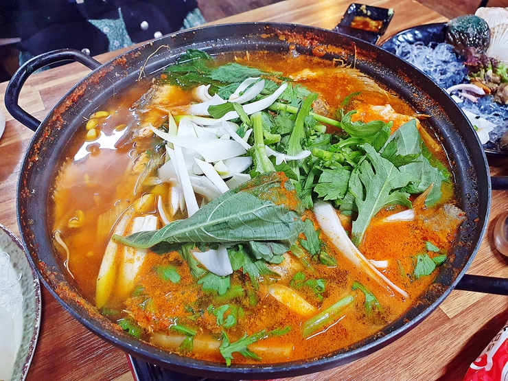 매운탕. 매운탕은 서더리를 사용해서 만든다. 흔히 생태, 대구와 우럭 매운탕을 최고로 치지만 이런 서더리 매운탕도 나쁘지 않다. 매운탕에 라면 사리가 기본으로 제공 되기 때문에 양이 많지 않은 사람이라면 추가적으로 공깃밥을 주문하지 않아도 된다.