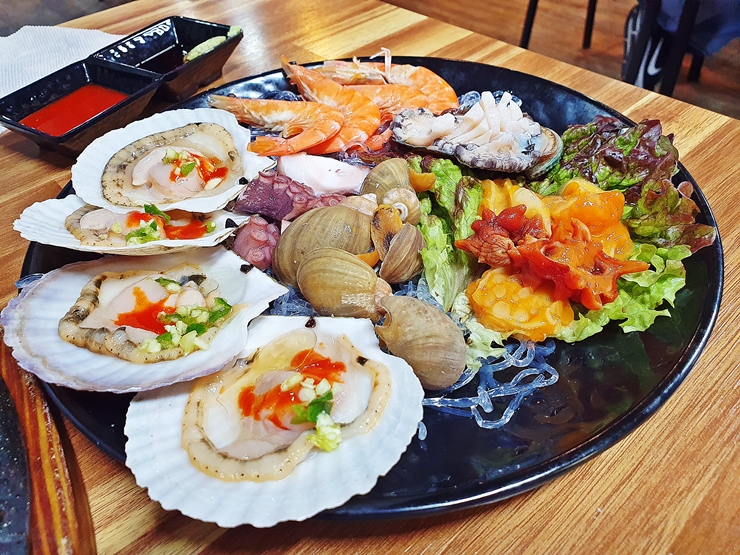 해산물 모둠. 가리비, 문어, 골뱅이, 새우, 전복과 멍게가 나온다. 난 해산물 중에서 멍게를 가장 좋아한다. 멍게의 살짝 씁쓸하면서도 시원한 맛은 그 어떤 해산물도 따라올 수 없는 맛이다. 짝꿍은 전복이 맛있다며 잘 먹었다. 해산물의 신선도가 상당히 좋아서 다른 것들도 맛있게 먹었다.