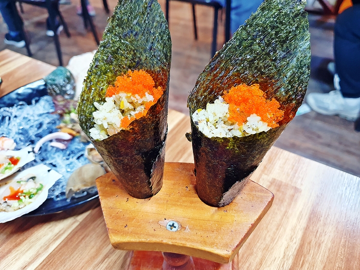 마끼. 마끼는 주먹밥을 김에 싸고 그 위에 날치 알을 올렸다. 그냥 밥이 나올 거라고 생각했는데 살짝 간이 된 마끼가 나와 놀랐다. 이 자체로도 훌륭한 소주 안주라 할 수 있다. 짝꿍이 마끼는 먹지 않고 매운탕에 라면 사리를 넣어 먹는다고 해서 마끼는 내가 전부 먹었다.
