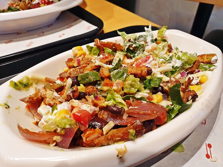 브리토 볼. 토핑을 하나도 빼지 않아 굉장히 풍족한 모습이다. 각 재료의 맛을 음미하기 위해서 하나 하나 개별로 먹어도 되고 전부 섞어 먹어도 된다. 개인 취향에 맞게 먹으면 되는 것이니 어떻게 먹어야 한다는 정답은 없다.