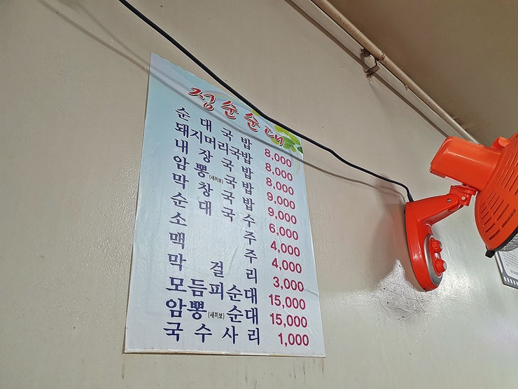 메뉴. 정선순대의 시그니처 메뉴라고 할 수 있는 순대국밥과 더불어 돼지머리국밥, 내장국밥, 암뽕국밥, 막창국밥, 순대국수, 모둠 피순대와 암뽕순대를 판매하고 있다. 정순순대의 특별한 점이 있는데 바로 소면 사리를 판매하는 것이다. 이 소면사리를 순댓국 안에 넣어 먹으면 참 맛있다. 우린 시그니처 메뉴인 순대국밥을 주문했다.