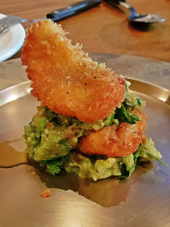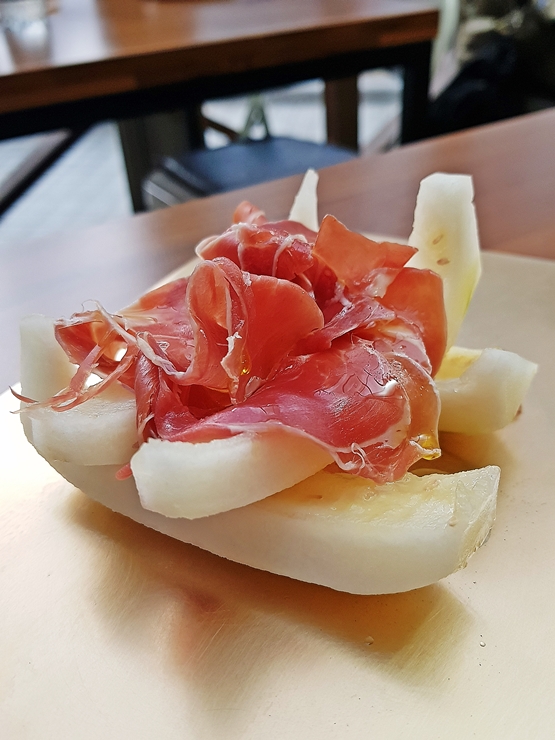 참외와 프로슈토. 햄 멜론이라 부르는 프로슈토 에 델로네를 변형한 것이다. 햄 멜론에 쓰이는 멜론은 당도가 과하지 않은 것이 적당한데, 햄 멜론에 어울리지 않는 어설픈 멜론을 쓰는 것보단 이렇게 참외를 사용하는 것이 한결 편하고 먹기 좋다. 전채로 먹기 딱 좋은 맛이었다.
