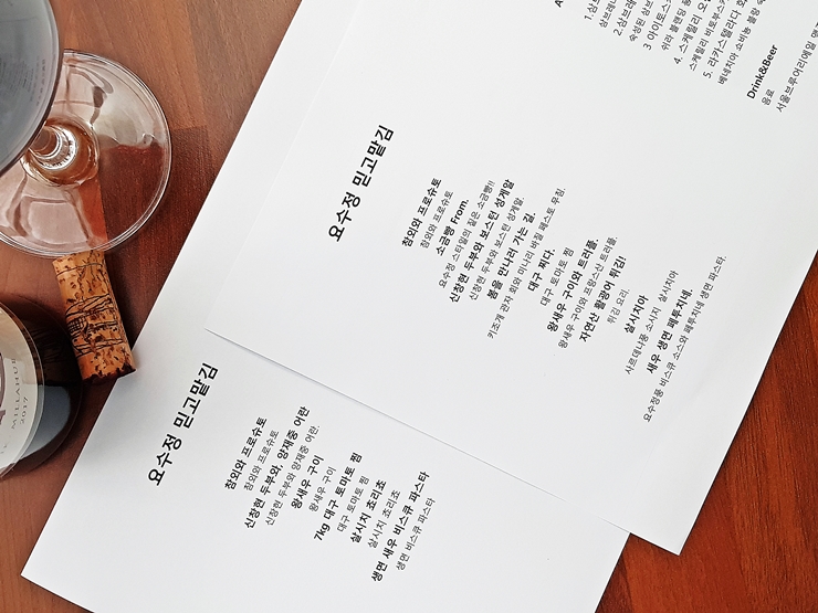 새우 생면 페투치네로 마무리. 요수정풍 비스크 소스를 이용해서 만들었다. 비스크 소스는 갑각류와 패각류를 푹 끓여 만든 소스를 말한다. 맛이 좋았지만 새우구이와 조금 겹치는 느낌이 들었다. 새우를 다른 갑각류나 패각류로 변경하면 더 큰 만족감을 느낄 것 같다. 합리적인 가격으로 수준 높은 퓨전 이탈리안 요리를 즐길 수 있는 요수정. 서강대, 대흥역 근처에서 맛있는 이탈리안 요리를 먹고 싶다면 추천하는 곳이다.