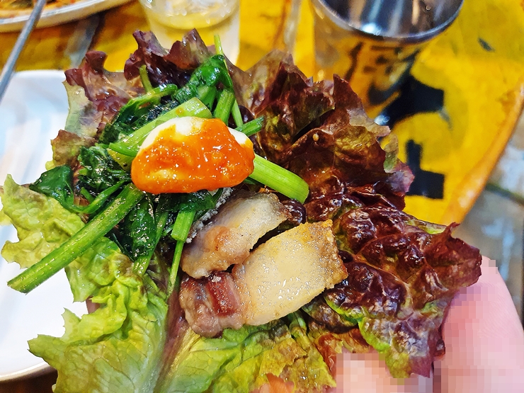 나와의 약속을 잘 지키는 멋진 나. 기름지면서 고소한 맛이 일품이다. 미나리가 없었으면 자칫 느끼하다는 인상을 받을 수 있었겠지만 미나리가 이 여분의 느끼함을 잘 잡아준다. 미나리와 고기의 궁합은 상당히 좋다. 특히 삼겹살 같은 기름진 부위와 먹을 때는 더욱 조화롭게 잘 즐길 수 있다. 보쌈 김치 위에 목살, 마늘과 파절이를 올려서도 냠냠. 보쌈 김치는 처음에 한 장 씩 구운 후 이렇게 고기와 함께 제공한다. 구운 보쌈 김치의 달달한 맛이 목살과 잘 어울리지 않을 거라 생각했는데 의외로 잘 어울려서 제법 놀랐다. 쌈장의 짠 맛과 보쌈 김치의 단 맛이 더욱 조화롭다. 이것이 바로 단짠단짠의 위력인가.