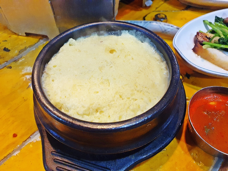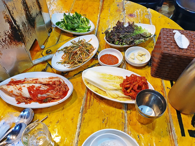 밑반찬. 김치, 보쌈김치, 파절이, 계란찜, 상추와 더불어 고기와 함께 구울 녹색 채소인 미나리가 나온다. 계란찜 간이 잘 맞아서 상당히 맛있게 먹었다. 예전에는 고기 구울 때 김치, 양파와 마늘을 제외한 다른 것들을 굽는 것에 굉장한 반감을 보였는데 이제는 묵묵히 잘 먹는다. 체질 개선을 위해 노력하는 멋진 나.