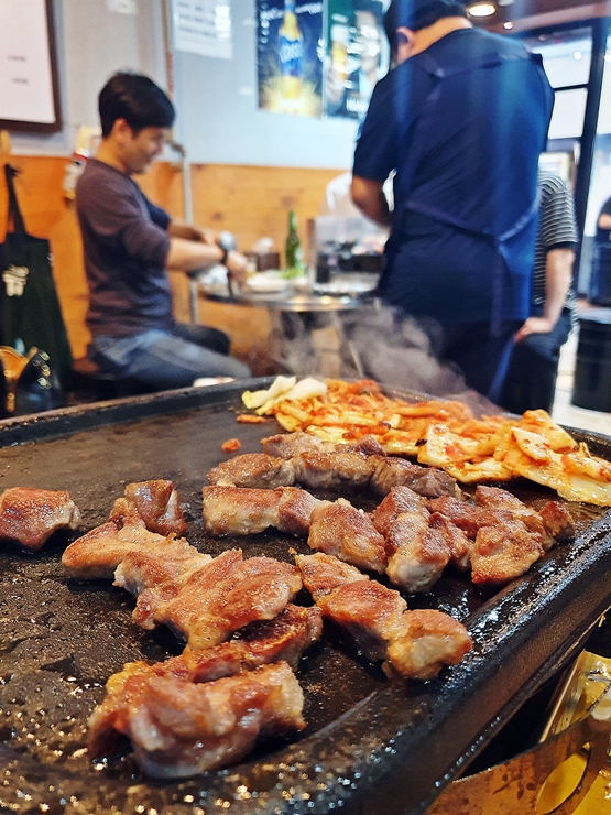 구워지는 과정은 과감히 생략하고 거의 다 구워지는 모습을 올리도록 한다. 서울고기집은 사장 및 직원들이 직접 고기를 구워준다. 그래서 고기가 구워지는 동안 밑반찬을 안주 삼아 하하호호 즐겁게 술잔을 들면 된다. 오랜만에 짝꿍과 소주를 마시니 참 기분이 좋고 금방 취하는 것 같기도 했다. 하지만 짝꿍보다 덜 취한 멋진 나.