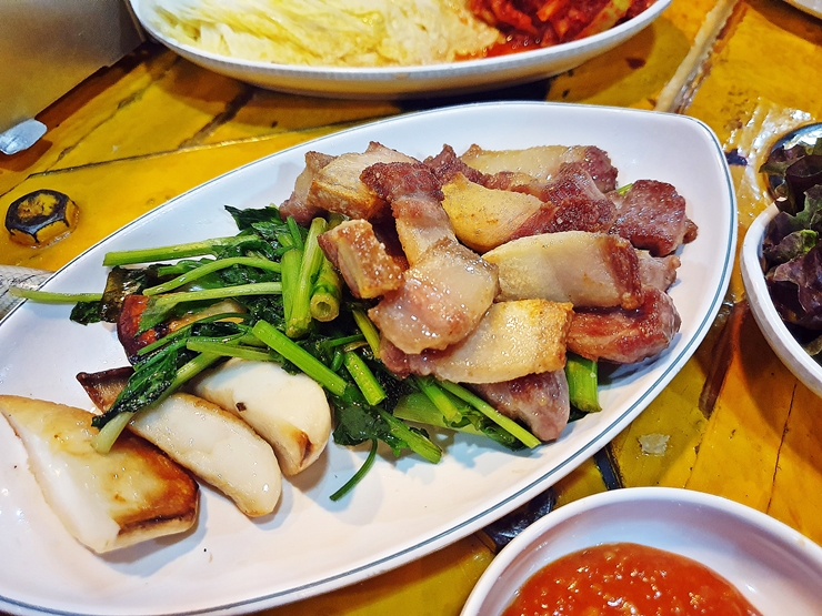 잘 구워진 목살 윗부분은 이렇게 새송이 버섯과 미나리와 함께 그릇에 준다. 그냥 먹는 것이 가장 맛있게 먹을 수 있는 방법이지만 이날은 고기 한 점을 먹더라도 영양 균형을 위해 상추에 싸서 먹기로 굳게 결심을 했다.