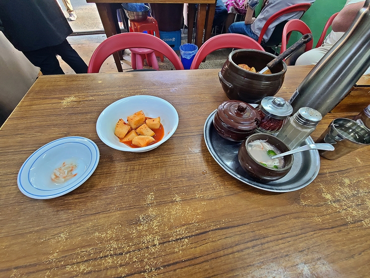 반찬은 굉장히 조촐하다. 새우젓과 깍두기가 전부다. 깍두기는 적당히 익어서 사각 거리는 식감과 시원한 맛을 함께 느낄 수 있었다. 자리에 앉자마자 순댓국 특을 주문하고 어서 나오길 기다렸다. 이렇게 맛있는 음식을 기다리는 시간은 참으로 힘들고 지치는 시간이 아닐 수 없다. 하지만 약수 순대국은 고객 회전이 빠르고 순댓국도 맥도날드 이상으로 빠르게 나오기 때문에 그리 오랜 시간을 기다리지 않아도 되는 큰 장점이 있다.