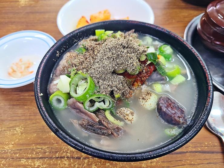 약수 순댓국 특. 정말 아름다운 모습이다. 순댓국에는 순대, 부속 고기, 다대기, 파와 들깨 가루가 들어있다. 기호에 맞게 들깨 가루를 더 넣어도 되고 덜어 먹어도 된다. 나는 다대기를 그리 좋아하지 않고 들깨 가루를 굉장히 좋아하기 때문에 다대기를 좀 덜고 들깨 가루를 더 넣어 먹었다.