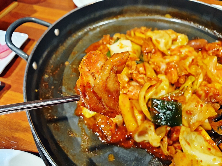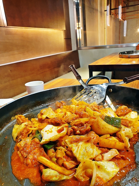 닭갈비. 참으로 아름다운 모습이다. 다른 것은 추가하지 않았는데 기본 정량이 꽤 되는 모습이다. 예전처럼 잘 먹을 때를 생각하고 다른 것을 추가했으면 음식을 남기는 큰 죄를 저질렀을 것 같다. 음식은 남기지 않아야 한다. 그것이 올바른 덕목이자 미덕이다. 닭갈비는 직원이 직접 조리를 해주기 때문에 맛있게 익기를 기다리면 된다. 지금 보니 기본 닭갈비에 떡이 들어 있었네. 나는 떡을 못 먹었는데. 그럼 짝꿍이 이걸 다..?