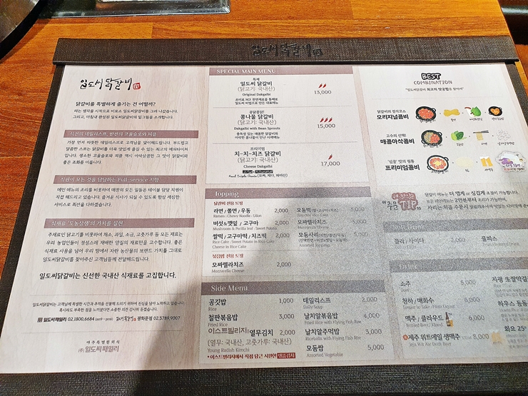 메뉴. 닭갈비는 세 종류가 있다. 평범한 일도씨 닭갈비, 콩나물이 들어간 매운 닭갈비와 치즈를 넣은 치즈 닭갈비이다. 그 밖에 닭갈비와 함께 먹으면 좋은 다양한 사이드 메뉴도 판매하고 있다. 나와 짝꿍은 많이 허기진 상태가 아니어서 일도씨 닭갈비와 볶음밥만 먹기로 했다. 내가 생각해도 내가 양이 많이 줄어들었구나.