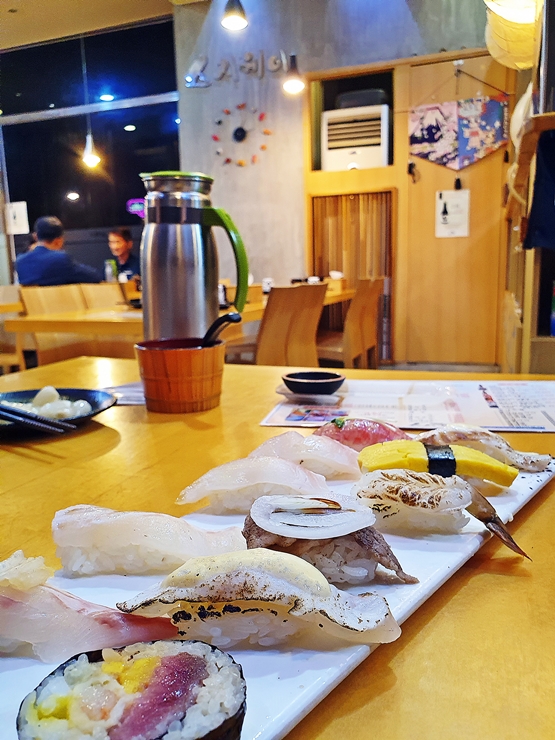 특초밥 세트. 후토마키를 포함하여 총 11점이 나온다. 참치, 광어, 도미, 계란, 새우 등의 구성이다. 가격에서 느낄 수 있지만 다양한 구성은 아니다. 이 가격에서 다양한 구성을 바란다면 그게 도둑이지. 오마카세의 유행과 고급 초밥의 보급으로 인해서 이제 초밥에 대한 눈높이가 예전보다 많이 올라갔다. 이런 캐주얼한 초밥에 대해 세세하게 맛을 평가하고 점수를 매기는 것은 그다지 큰 의미가 없는 것 같다. 저렴한 가격의 보급 초밥을 먹는 것으로 만족하면 된다.