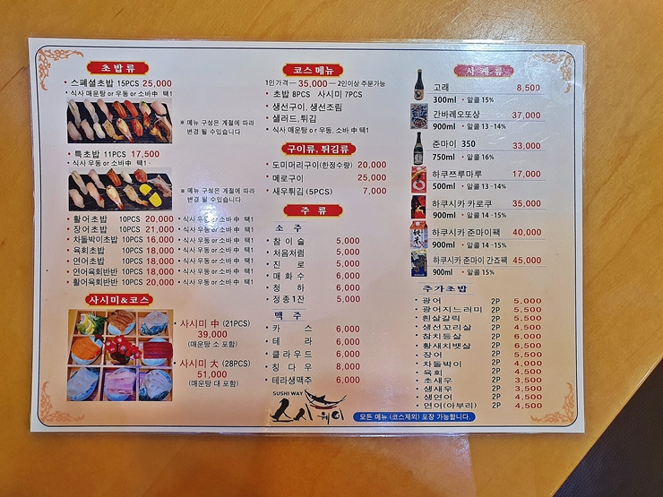 메뉴. 초밥, 회, 구이와 튀김 등을 판매한다. 생각보다 다양한 주류도 판매하고 있었다. 가볍게 맥주 한 잔을 즐기며 낮술을 하고 싶었지만 당분간 술을 마시지 않기로 다짐을 했기 때문에 욕망을 꾹 참고 된장국과 함께 초밥을 먹었다. 우리는 초밥 11피스가 나오는 특초밥을 주문했다.