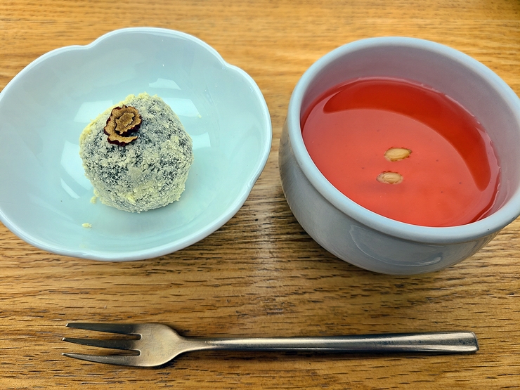 쑥구리단자와 오미자 차. 쑥구리단자는 보풀떡이라는 이름으로도 유명하다. 쑥을 섞어 넣은 찹살 가루로 만들고 고물을 묻혔다. 디저트로 먹기에는 조금 무거운 감이 있긴 했지만 오미자 차와 함께 먹으니 상당히 조화로운 느낌이었다. 충무로에서 고즈넉한 풍경을 즐기며 맛있는 한정식을 먹고 싶다면 추천하는 곳이다.