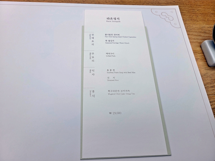 거나하게 즐길 자리는 아니었기 때문에 점심 중에서 가장 가벼운 라온 정식을 주문했다. 전채, 요리, 식사와 후식이 나오는 간단한 코스다. 이젠 많이 먹고 싶어도 못 먹는 현실이 슬프구나. 한국의 집은 계절에 맞는 제철 식재료를 사용해서 코스를 구성하는데 간단하지만 정갈한 매력이 있다.