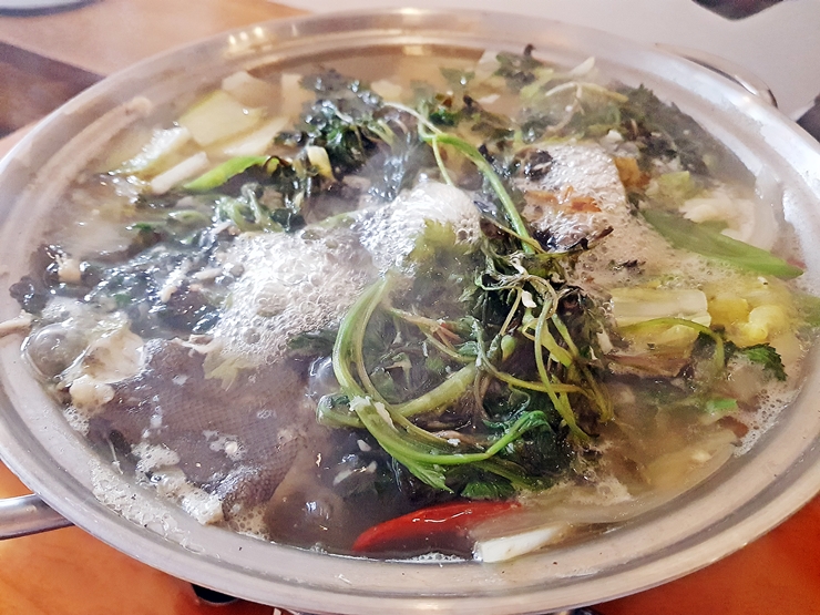 아름다운 도다리 쑥국의 모습. 쑥이 한가득 올라간 것이 인상 깊다. 제철 맞은 도다리는 담백하면서도 은은하게 고소한 맛이 나는데 쑥과 굉장히 잘 어울린다. 쑥의 향긋함과 담백함이 잘 어우러진다. 봄에만 먹을 수 있는 이런 음식은 제철을 놓치면 1년이 서운하고 아쉽다.