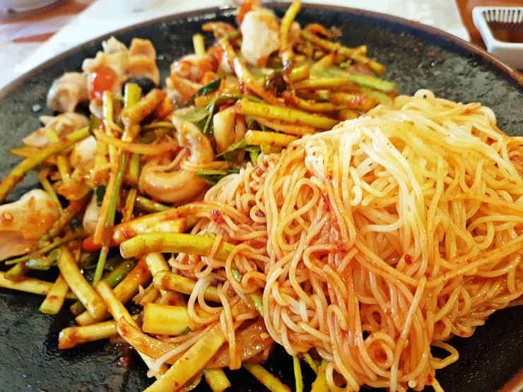 결국 술 안주가 더 필요하게 되어서 주문한 백골뱅이 소면과 미나리 무침. 잘 삶은 백골뱅이, 미나리 무침과 소면이 함께 나온다. 취하지 않았을 거라 생각했는데 사진이 조금씩 흔들린 것을 보면 살짝 취한 것 같기도 하다. 소면은 비빔장과 따로 비비고 백골뱅이는 미나리 무침과 비비면 된다.