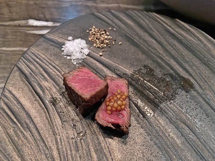 유자 머스타드를 올린 등심. 유자 머스타드는 알싸한 맛은 덜하고 상큼한 맛이 난다. 톡톡 거리는 머스터드의 식감과 등심이 잘 어울렸다. 그래도 내 입에는 소금만 살짝 찍어 먹는 것이 좋다.