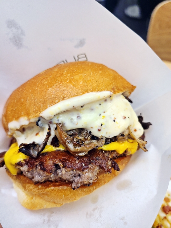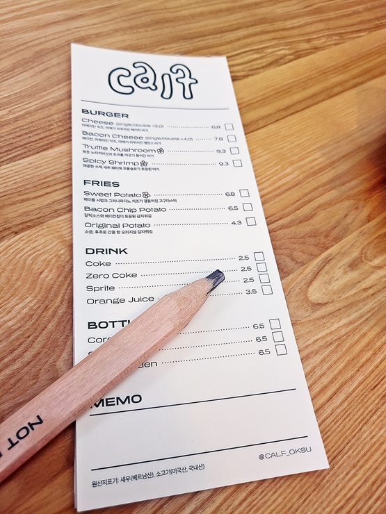 메뉴. 버거류는 치즈, 베이컨 치즈, 트러플 머쉬룸 버거와 스파이시 쉬림프 버거가 있고 후라이는 오리지날, 스위트 포테이토, 베이컨칩 포테이토가 있다. 특이하게 버거+후라이+음료 조합의 세트가 없었다. 먹고 싶은 것을 체크한 후 선불로 결제하는 시스템이다. 트러플 머쉬룸 버거, 베이컨칩 포테이토와 콜라를 주문. 여기까지 왔으면 후회하지 않도록 든든히 먹어야지.