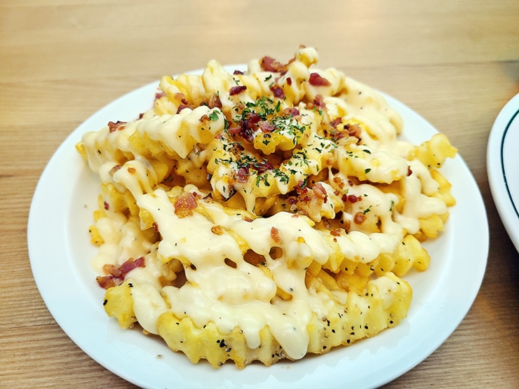 베이컨칩 포테이토. 후라이에 뿌려진 소스는 갈릭 소스다. 후라이 위에 곱디고운 베이컨칩이 뿌려져있다. 트러플 머쉬룸 버거에서 큰 만족감을 느꼈으니 큰 기대를 하며 베이컨칩 포테이토를 먹었다. 갈릭 소스와 베이컨칩이 후라이와 잘 어울린다. 맛은 참 좋았지만 트러플 머쉬룸 버거에서 굉장히 높은 만족을 느껴서 그런지 몰라도 후라이는 버거만큼의 높은 만족을 느끼진 못했다. 후라이가 맛이 없었다는 뜻은 절대 아니다. 약수역의 수제 버거 신흥 강자, 캘프. 진하고 맛있는 수제 버거를 먹고 싶다면 꼭 한 번 가볼 곳으로 추천하는 곳이다.