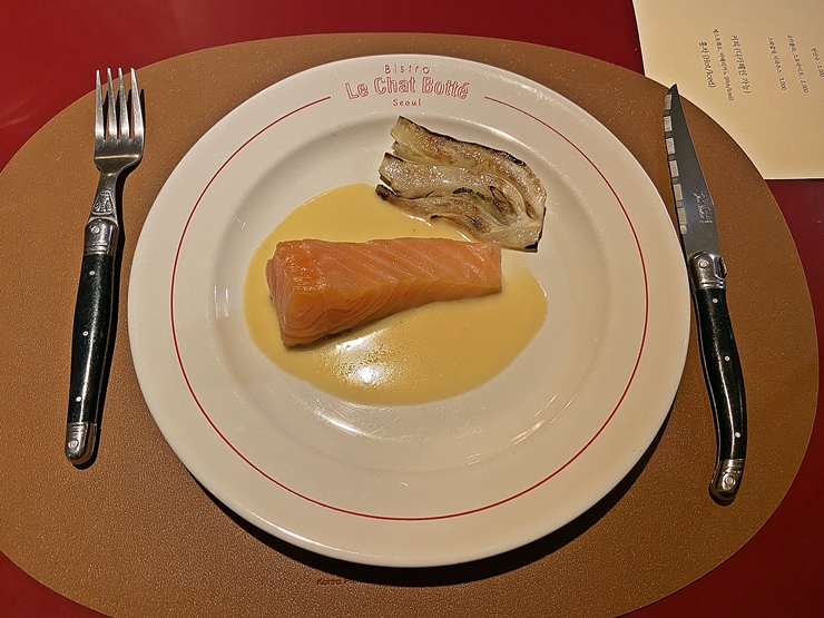 반숙 연어 구이. 연어를 찐 것 같은 식감을 느낄 수 있다. 버흐블랑 소스는 프랑스에서 가장 대중적인 소스라고 하는데 살짝 느끼한 맛이 있었지만 거슬릴 정도는 아니었고 연어와 궁합이 좋았다.