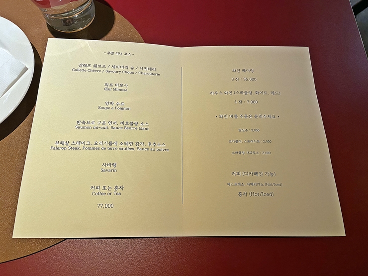 평일에는 단품으로 주문이 가능하지만 주말에는 코스 요리만 주문할 수 있다. 코스는 후식까지 포함하여 7코스로 나온다. 가격을 고려하면 적당한 구성이라 할 수 있다.