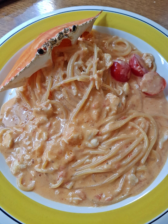 뒤 이어 나온 로제 파스타. 나를 바라보는 꽃게의 눈빛이 예사롭지 않다. 꽃게 녀석에게는 굉장히 미안할 따름이지만 이게 바로 약육강식의 세계라는 것을 알려주었다. 예상했던 것보다 더욱 맛이 좋다. 지금까지 먹어본 로제 파스타 중 순위를 꼽으라면 세 손가락 안에 들어갈 맛이다. 게살이 굉장히 많이 들어간 꾸덕한 소스가 굉장히 인상 깊게 나의 입맛을 사로잡는다. 명란오일파스타가 그냥 '아, 맛있네.' 정도였으면 이 로제 파스타는 '오..엄청 맛있네.' 수준이었다.