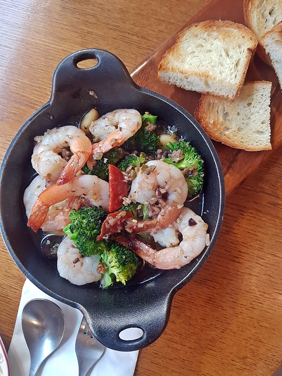 가장 먼저 나온 감바스. 새우, 브로콜리, 토마토와 올리브 등이 섭섭하지 않게 제법 들어 있는 모습이다. 비록 기름이 묻긴 했지만 기름 묻은 브로콜리도 엄연한 채소이니 많이 먹어야지.
