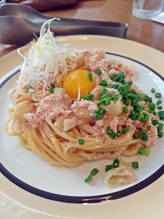명란 오일 파스타. 명란젓을 가득 넣고 파스타 위에 계란 노른자를 살포시 올려내었다. 노른자를 성실히 잘 버무린 후, 앞젚시에 덜어서 맛있게 냠냠. 오일 베이스이지만 전혀 느끼하지 않다. 명란의 짭짤한 맛이 느끼한 맛을 잘 잡아준다. 또한 담백하면서도 진한 맛을 같이 느낄 수 있다. 왜 내가 파스타를 하면 이런 맛이 안 나는 거지.