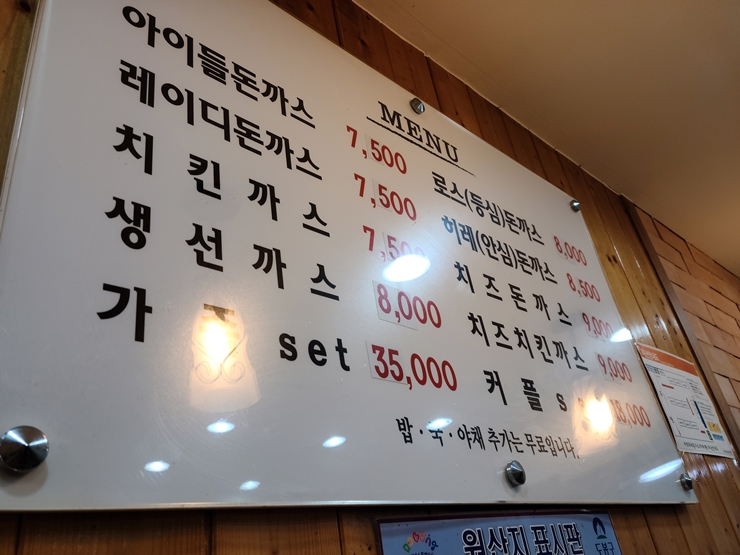메뉴. 등심과 안심이 가장 잘 나간다고 하며 커플 세트도 제법 인기가 있다고 한다. 혼자 왔기 때문에 등심 돈까스를 주문했다. 등심 돈까스를 주문하고 기다리고 있는데 휴가 나온 군인과 그의 여자친구가 들어와서 가족 세트를 주문하는 것을 보고 살짝 놀랐다. 누군지는 모르지만 몸 무사히 전역하기를.