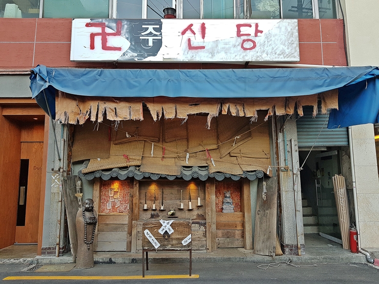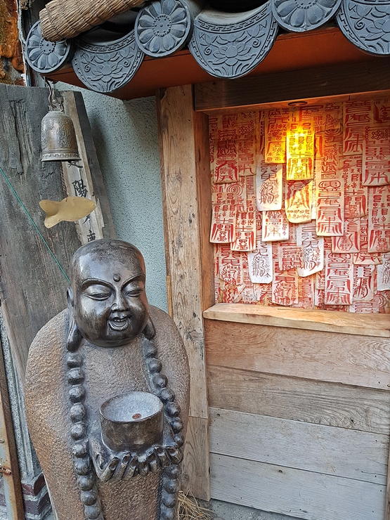 입구 앞에 이런 상이 있다. 한국식 불상이라고 말하긴 좀 무리가 있고 일본과 중국의 불상 스타일을 혼합한 것 같다. 인상이 굉장히 독특하다. 이 입구를 못 찾고 헤매는 사람이 간혹 있다고 한다.