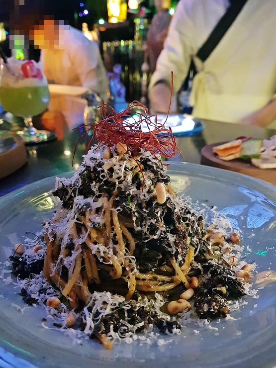 곤드레유. 들기름을 베이스로 만든 오일 파스타인데 곤드레를 가득 넣어 한국식 맛을 가미했다. 파스타보다는 들기름 막국수 같은 맛이었다. 들기름의 고고한 맛이 식욕을 자극해서 탄수화물을 줄이고 있는 나도 허겁지겁 먹었다. 이날 먹은 것 중 가장 만족도가 높았던 음식. 분위기나 안주 수준만큼 칵테일 수준도 높았다면, 만족감을 느꼈을 것 같지만 오히려 아쉬움이 남았다. 이색적인 분위기의 칵테일 바를 가고 싶다면 추천한다.