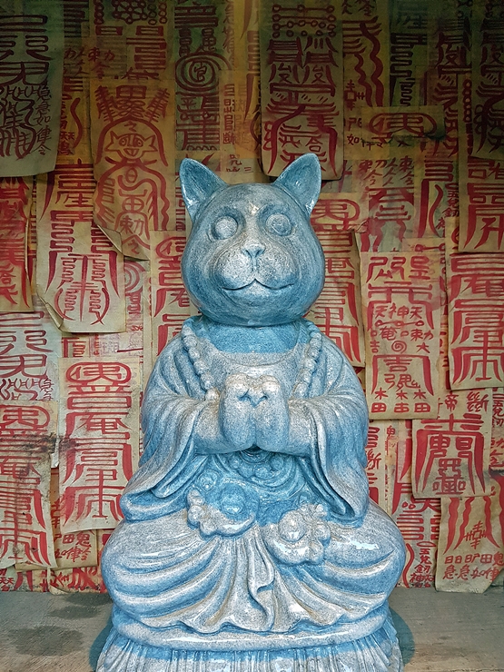 12지신 중 개인 것 같은데 생긴 것은 고양이를 더 닮았다. 이것을 돌리면서 밀면 문이 열린다. 의미를 알 수 없는 부적이 많이 붙어 있었다. 마치 외계인처럼 이상하게 생긴 그림이 부적에 그려져 있는 것을 보면 아무 것도 아닌 것 같다.