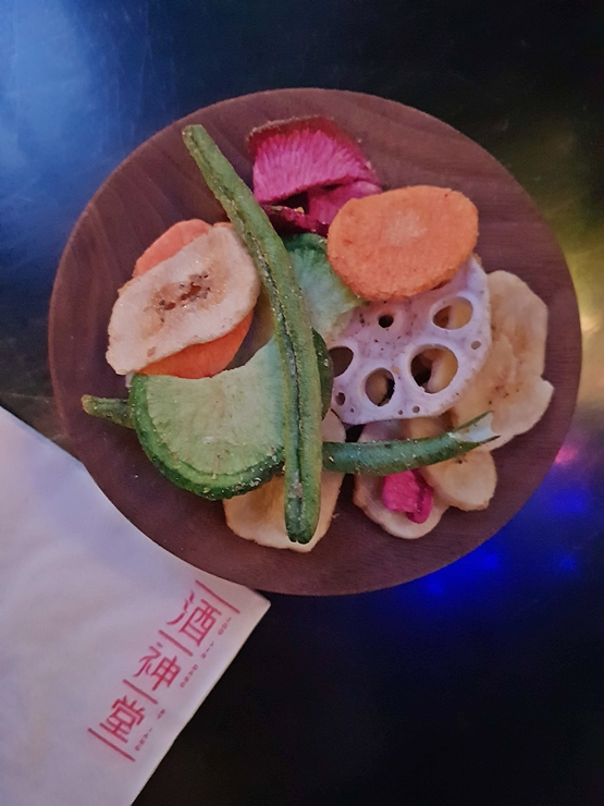 칵테일을 주문하면 나오는 기본 안주. 채소를 한 번 건조 시킨 후 다시 튀겨냈다. 달달하면서도 살짝 고소한 맛이 나기 때문에 계속해서 손이 가게 만드는 장점과 단점이 있다. 수제는 아닌 것 같고 기성품을 사용하는 것 같다.