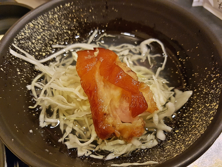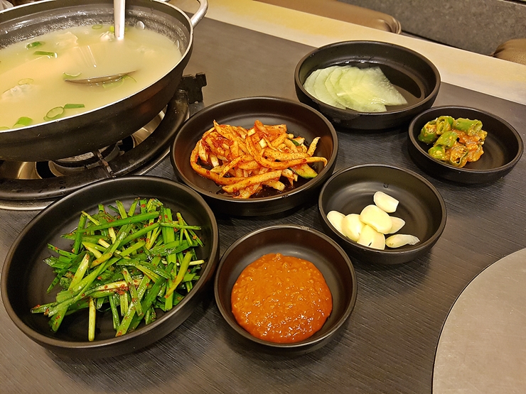 주문하고 빠르게 깔리는 밑반찬과 만둣국. 밑반찬은 작년이나 올해나 똑같이 나온다. 만둣국은 기성품 떡국떡과 물만두용 만두를 넣어 가볍게 끓인 것인데, 이게 없으면 괜히 서운하다. 소주를 마실 때 국물이나 음료가 필요한데 이 만둣국이 그러한 역할을 톡톡히 잘 해준다.