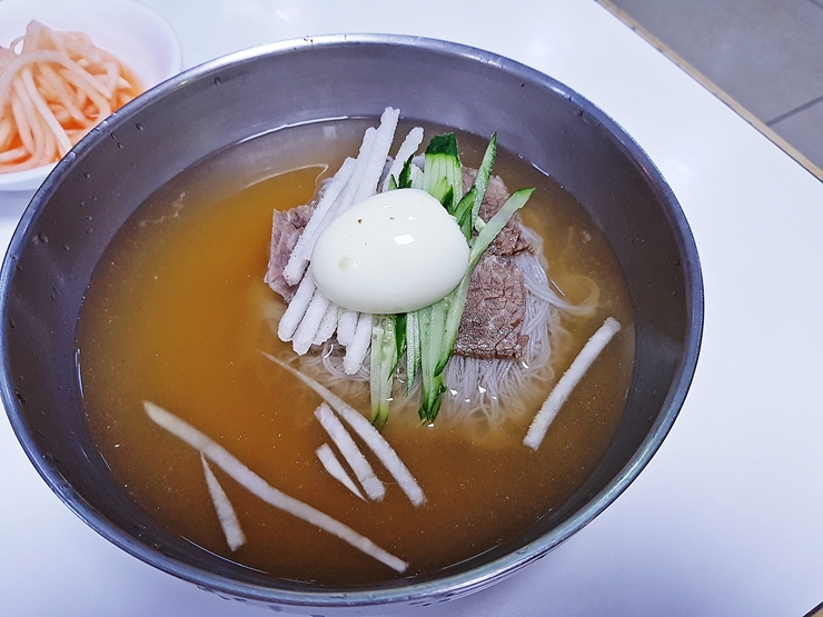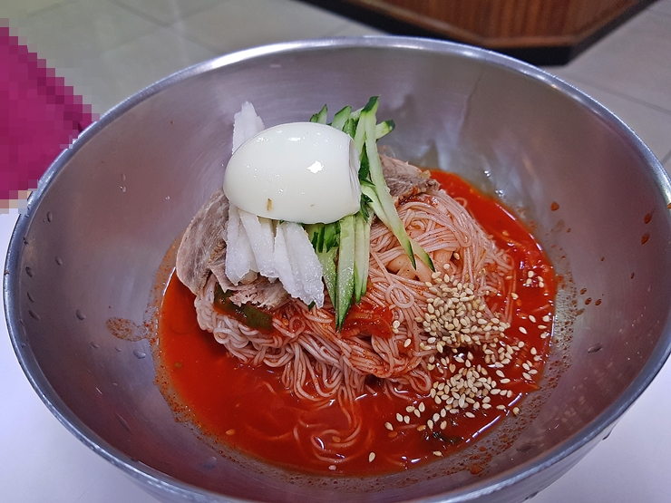내가 주문한 물냉면. 평양냉면과 달리 육수 색이 굉장히 진하다. 마치 진주냉면의 육수를 보는 느낌이었다. 육수를 제외한 나머지 구성은 비빔냉면과 동일하다.