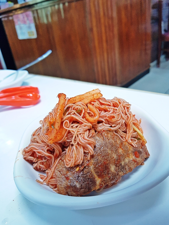 내부 모습. 명동의 함흥면옥은 1965년에 개업한 후 한 곳에서 쭉 자리를 지키며 영업을 한다고 한다. 명동은 이렇게 오랜 역사를 지닌 노포가 있는 반면 1-2년을 못 버티고 가게와 주인이 바뀌는 곳도 있다. 짝꿍이 함흥식 물냉면과 비빔냉면을 모두 먹자고 해서 난 물냉면을 주문하고 짝꿍은 비빔냉면을 주문했다. 함흥식 냉면은 비빔냉면이 원조라고 하지만 물냉면 역시 비빔냉면에 못지 않게 맛이 상당히 좋은 편이다.