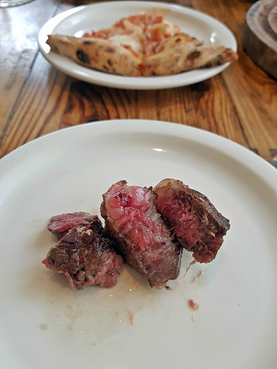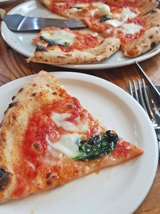 와인을 주문했으니 피자도 먹어야지. 풀만 먹어서는 제대로 만족감을 느끼기 힘들다. 그래서 주문한 전형적인 나폴리 피자인 마르게리타. 마르게리타는 이탈리아산 생모짜렐라 치즈와 함께 캄파니아산 토마토를 사용해서 만든다고 한다. 그럼 이제 티본 스테이크가 나오기 전에 맛있게 먹어보자.