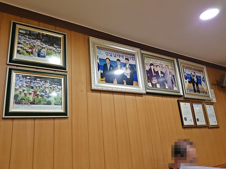 몇 분간의 웨이팅을 한 후 들어왔다. 홀에서 먹고 싶었는데 아쉽게도 홀은 전부 만석이어서 방으로 안내를 받았다. 방에도 많은 고객들로 북적거린다. 내부에는 상다히 많은 액자가 있는데, 유명인들이 전주회관에 방문해서 찍은 사진과, 진주회관의 히스토리를 지지고 있는 사진들이 있다. 액자 외에 표창장 같은 것도 꽤 많이 걸려 있었다.